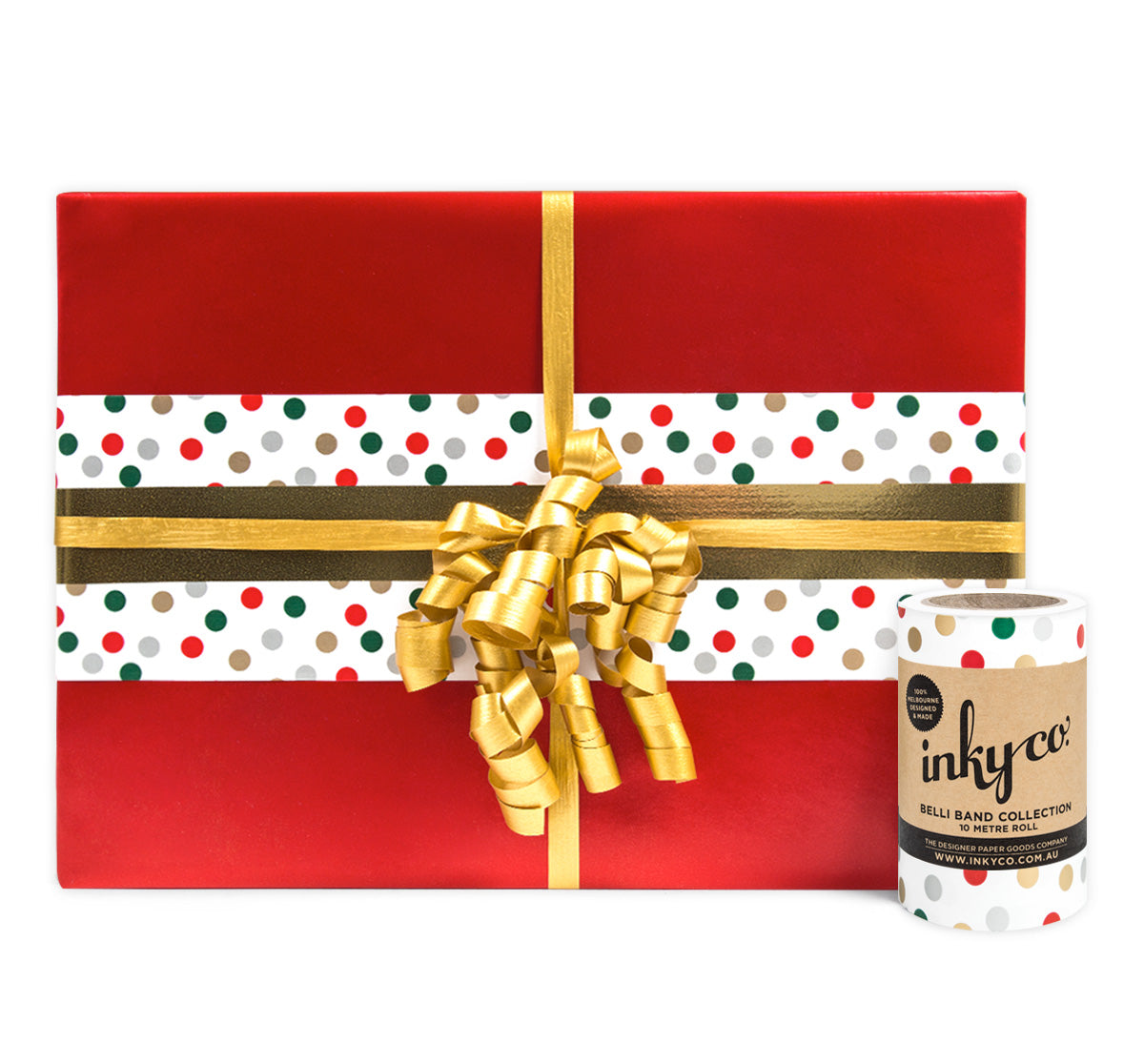 Confetti Xmas Belli-Band® is the perfect Christmas party paper featuring holly green, gold, red and silver inks printed on white semi gloss wrapping paper.