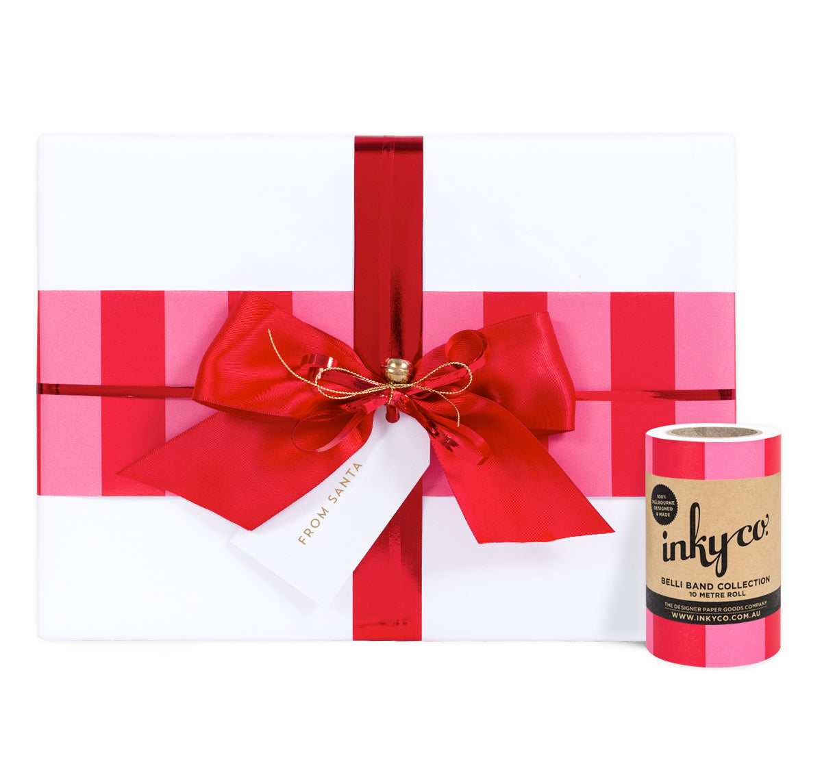 Stripe Pink Belli-Band®  features a thick red stripe over a pink background, printed on matt white wrapping paper.