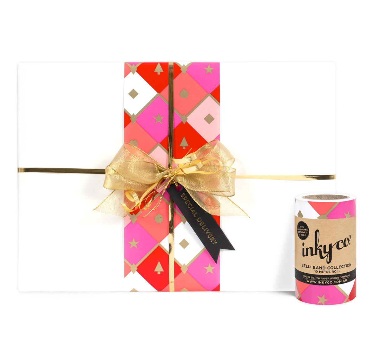 A simple and chic Christmas pattern, Diamonds Belli-Band® is printed in festive shades of red, pink, and gold on white semi gloss wrapping paper.