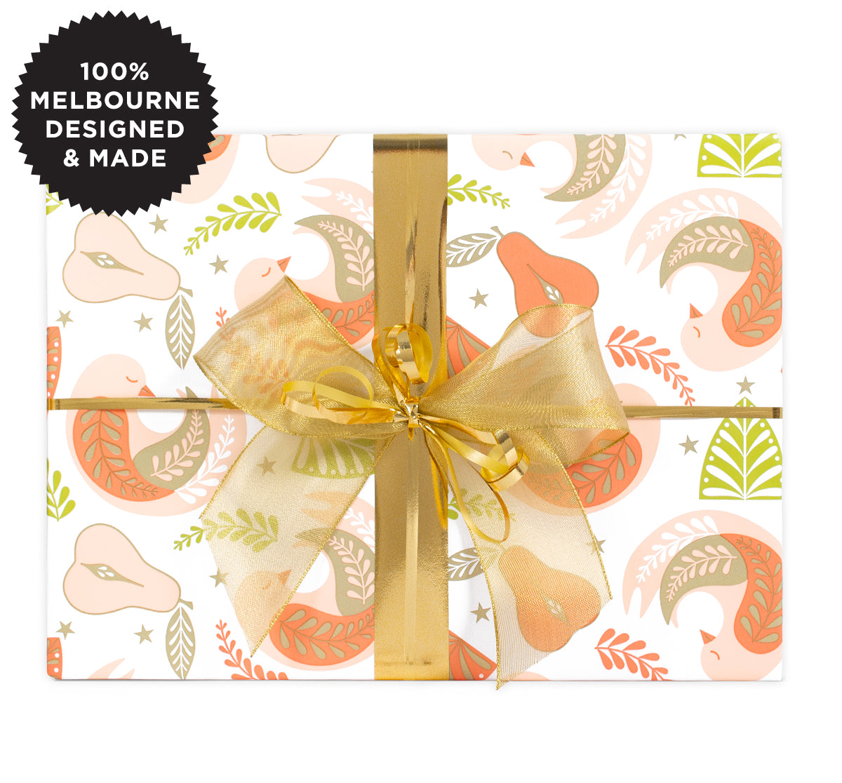 In A Pear Tree is a whimsical Christmas pattern featuring coral, nude, avocado and gold inks on white semi gloss wrapping paper.