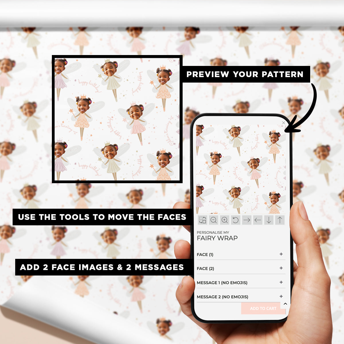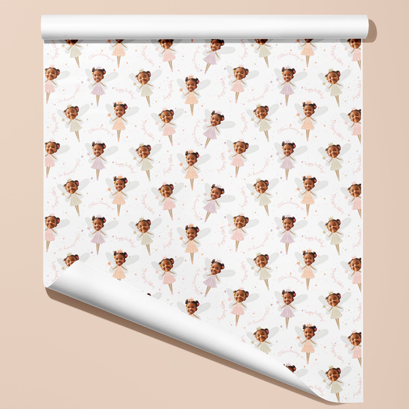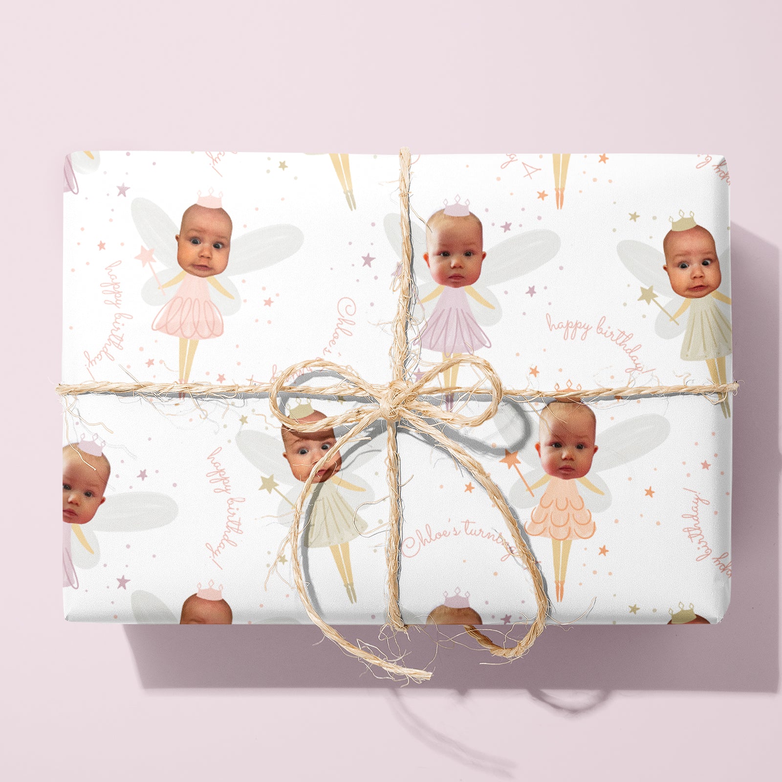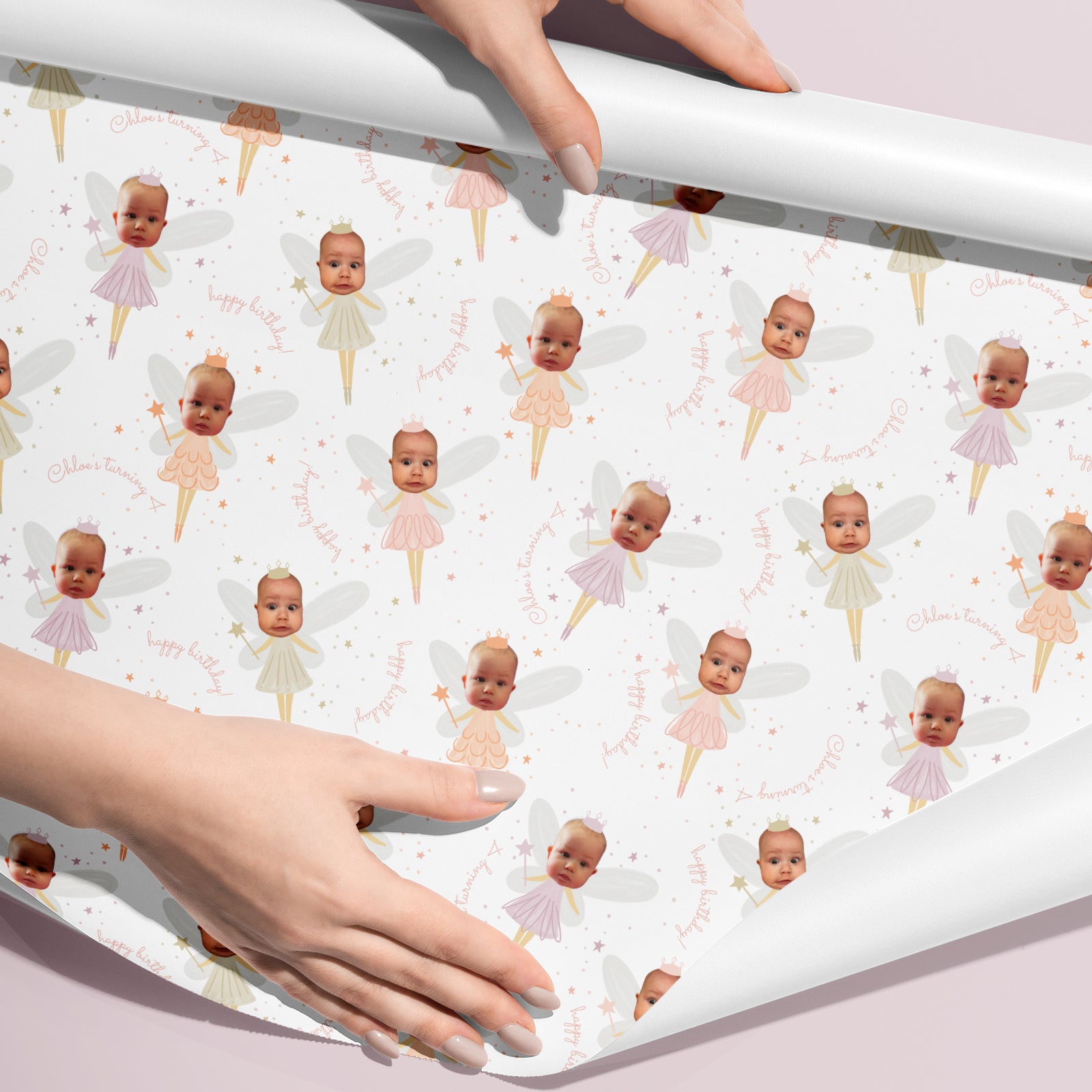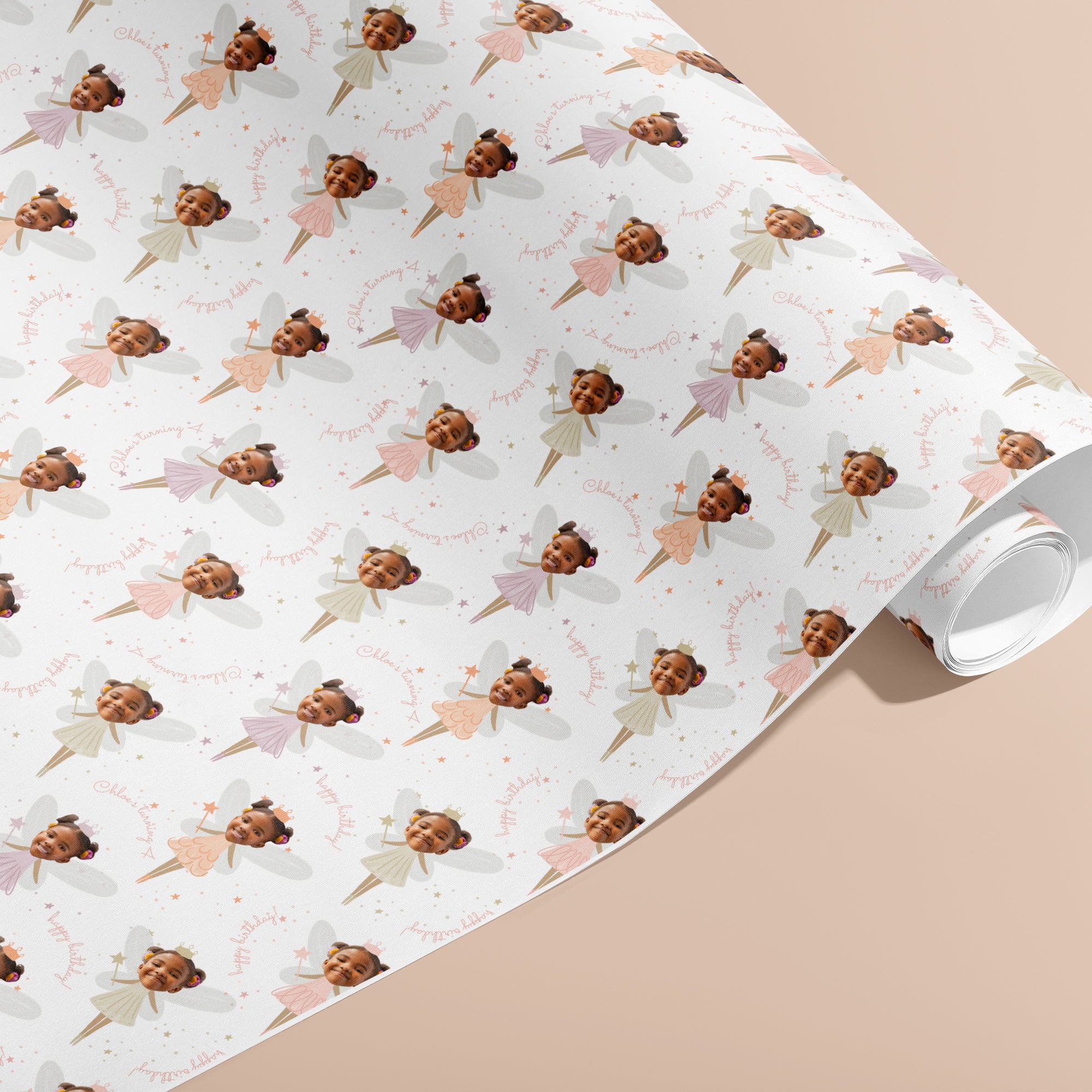Introducing our enchanting personalisable wrapping paper, perfect for little girls who adore fairies! This magical wrapping paper is designed to bring smiles and spark imagination, featuring a whimsical fairy pattern in soft pastel tones. The highlight of this special wrapping paper is the unique touch, this design showcases the face of the special girl transformed into a charming fairy, with her face beautifully integrated onto an adorable fairy body. Delight your little fairy lover with this one-of-a-kind wrapping paper and make her present a magical moment to remember.