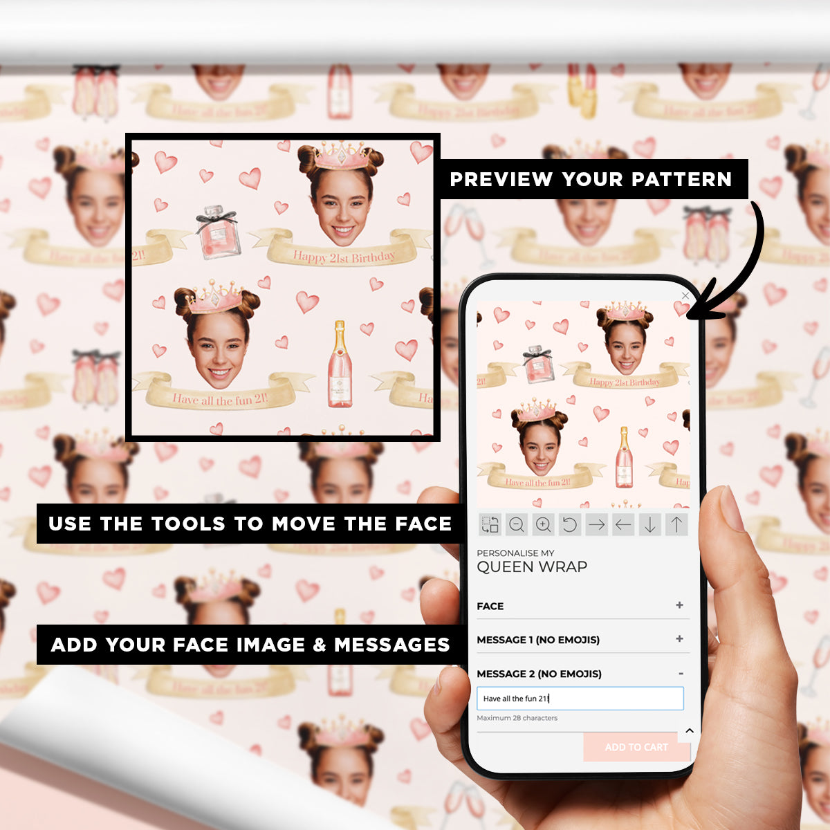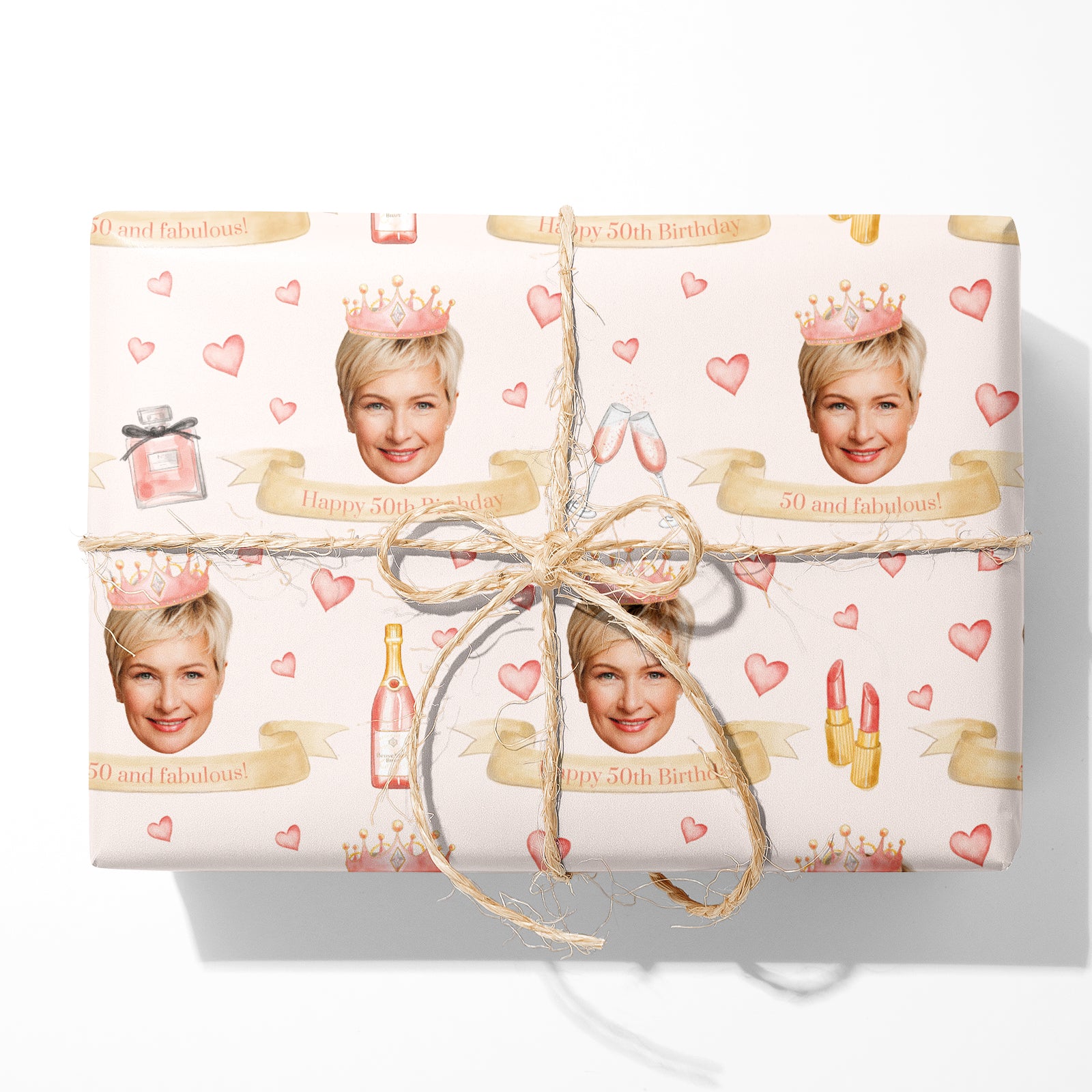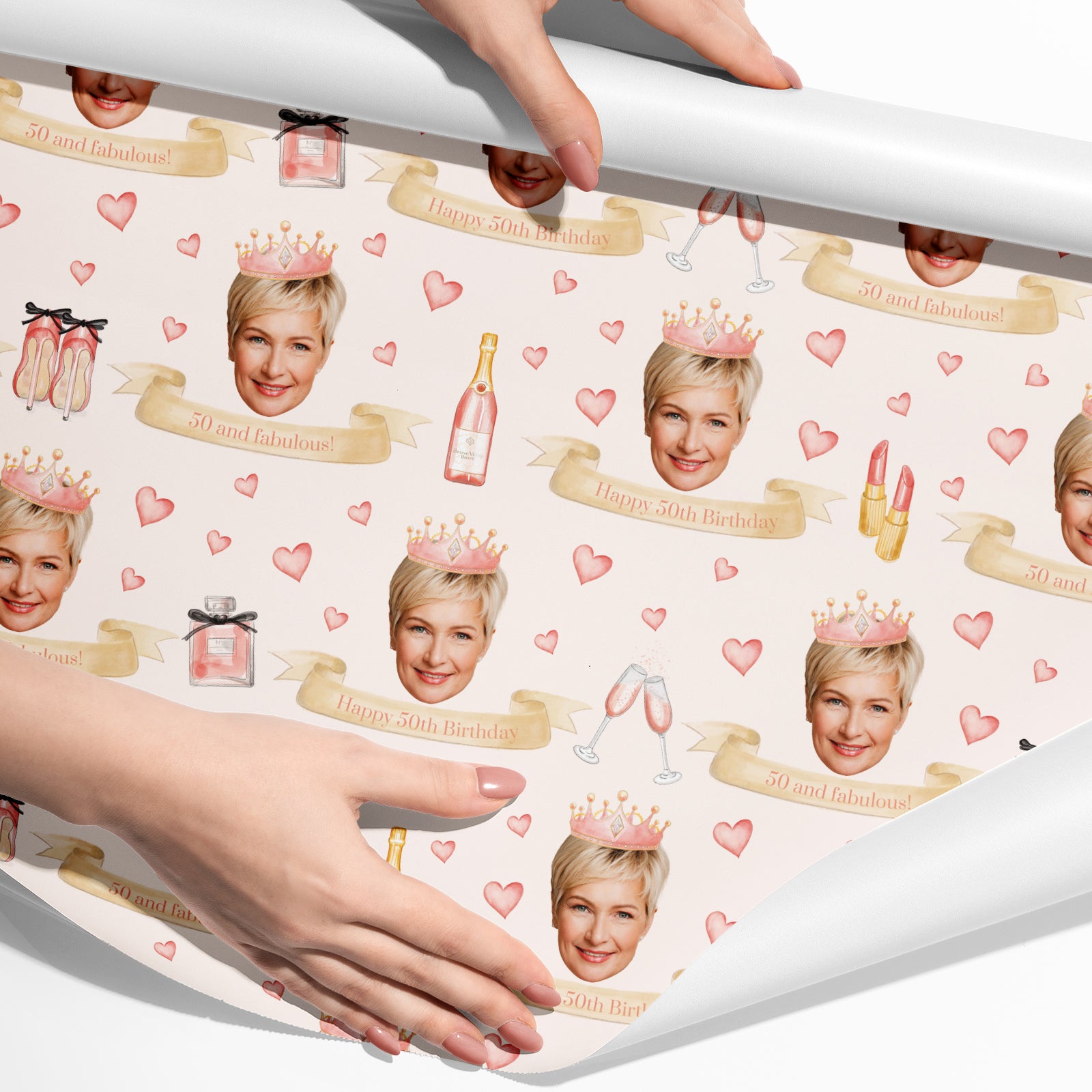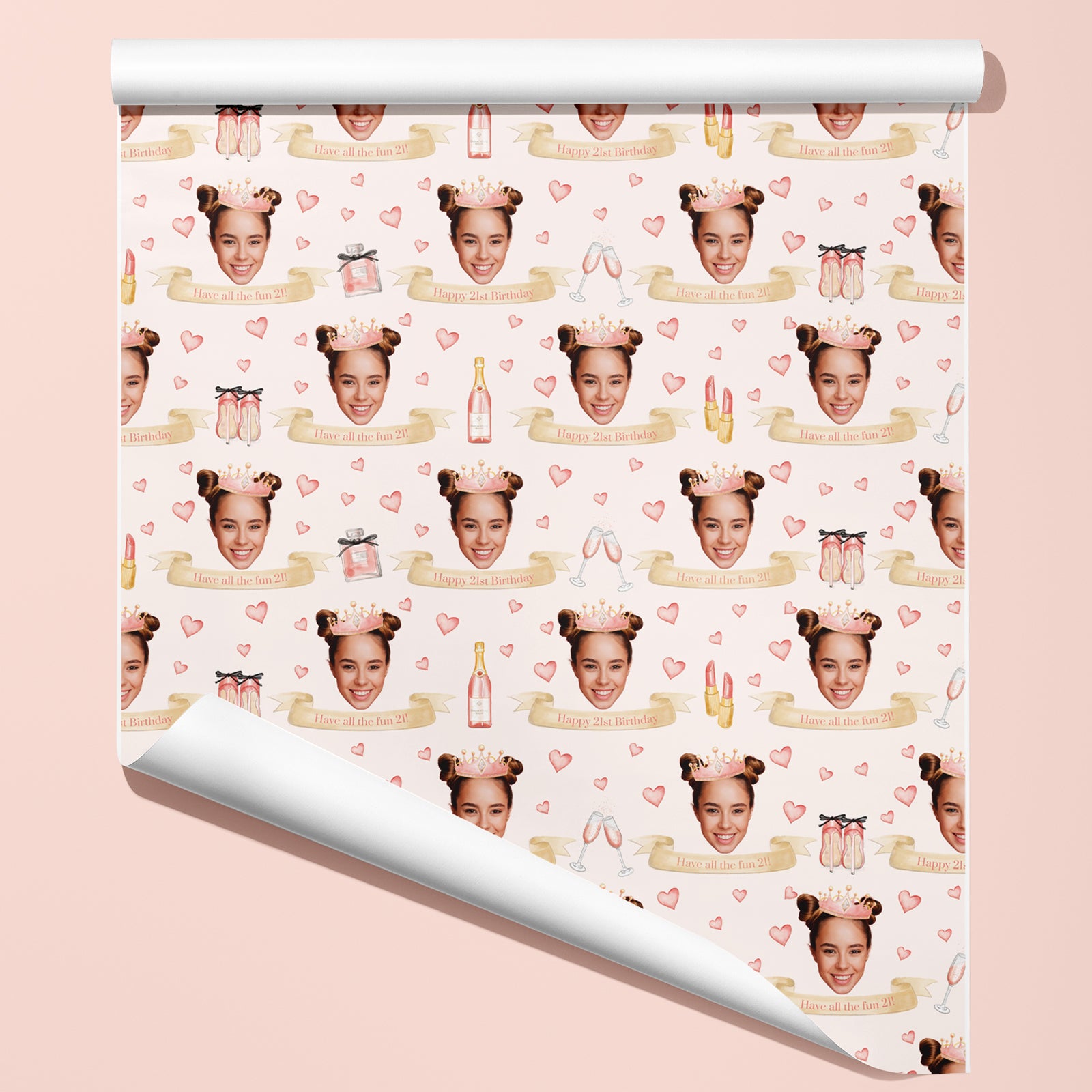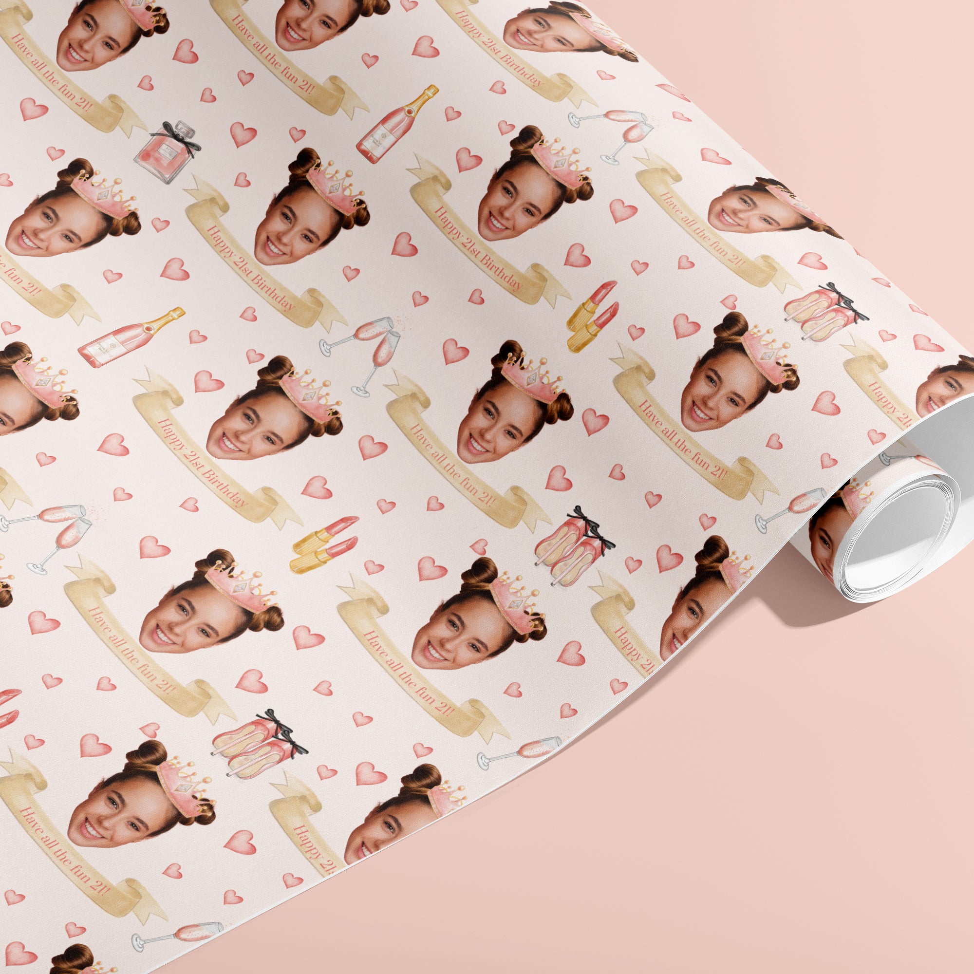 Introducing our personalised wrapping paper, designed to add an extra special touch to the celebration! This wrapping paper features a chic pattern adorned with champagne and bubbling glasses along with stylish women's accessories. But here's the twist! You can add the birthday girl's face to this gorgeous pattern, making it truly unique and memorable. Imagine her delight as she sees herself featured on wrapping paper for her special day!