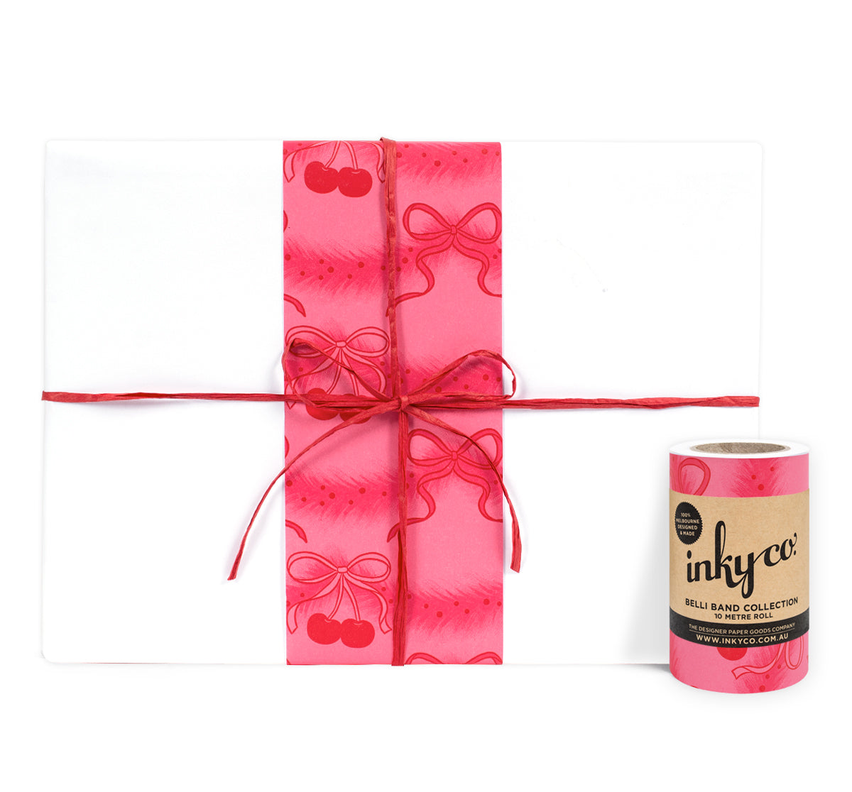 New Colourway! Cherry Christmas Belli-Band® is a fun Christmas pattern featuring red and pink ink printed on matte white wrapping paper.