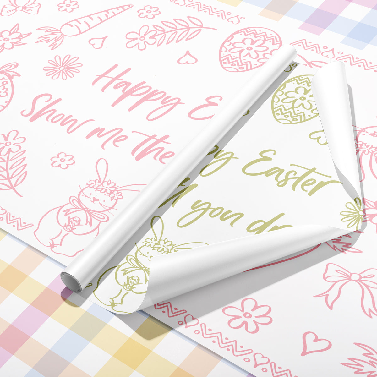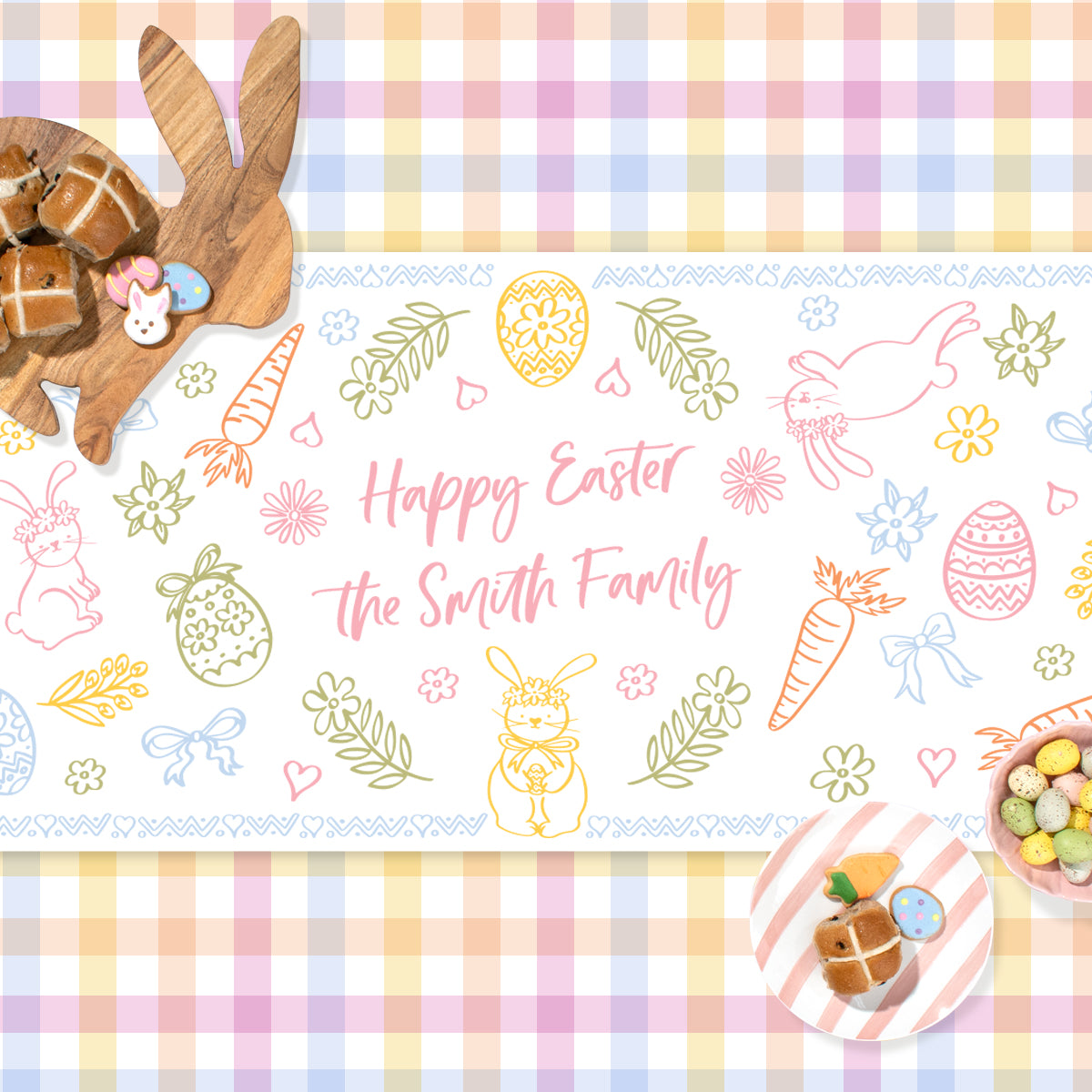 Introducing our personalised table runners! Dress your holiday table in festive style with our personalisable paper table runner, featuring charming hand-drawn Easter illustrations like bunnies, decorative eggs, carrots, and flowers.