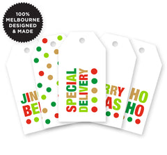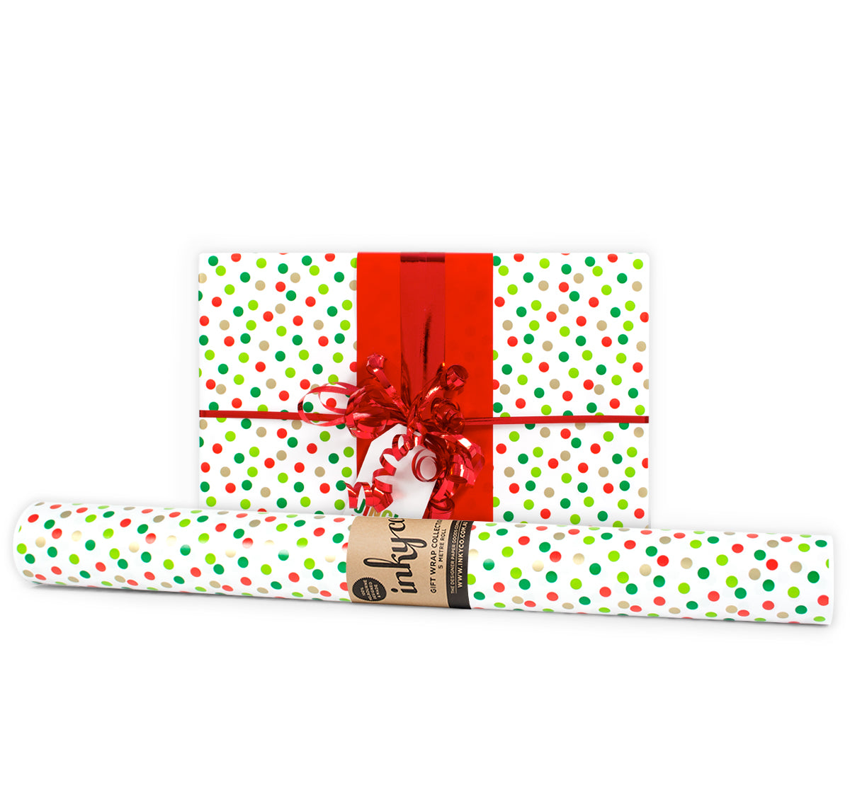 New Colourway! Confetti Xmas is the perfect Christmas party paper featuring dark green, gold, red and light green inks printed on white semi gloss wrapping paper.